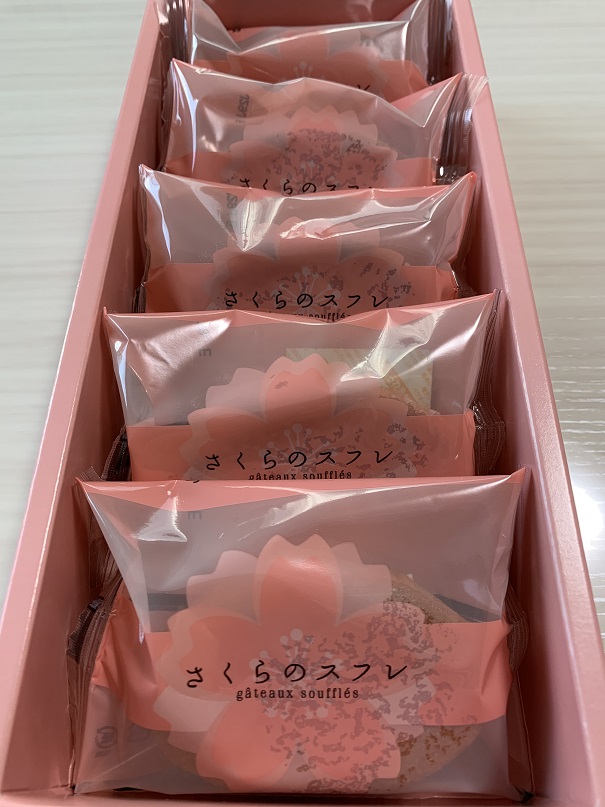 薄いピンク色にデザインされたパッケージの桜もやさしい春の季節感を感じる。さくらのスフレというそのままのネーミングも飾らないおしとやかな気品の良さも好感を覚える。